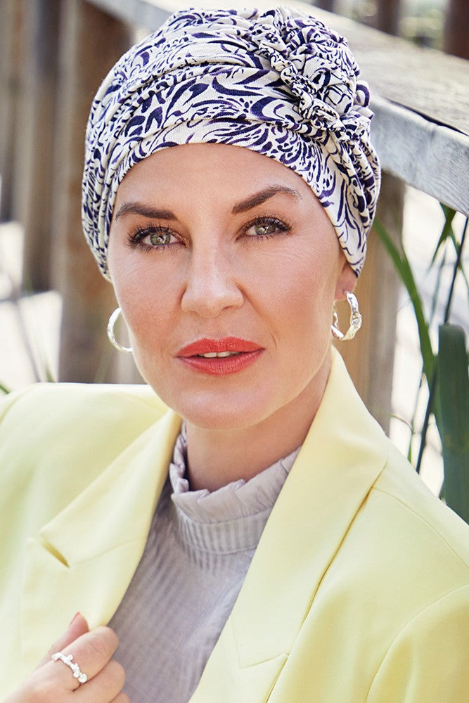 Copricapo senza nastri in tessuto arricciato con decorazione laterale. Fantasia.